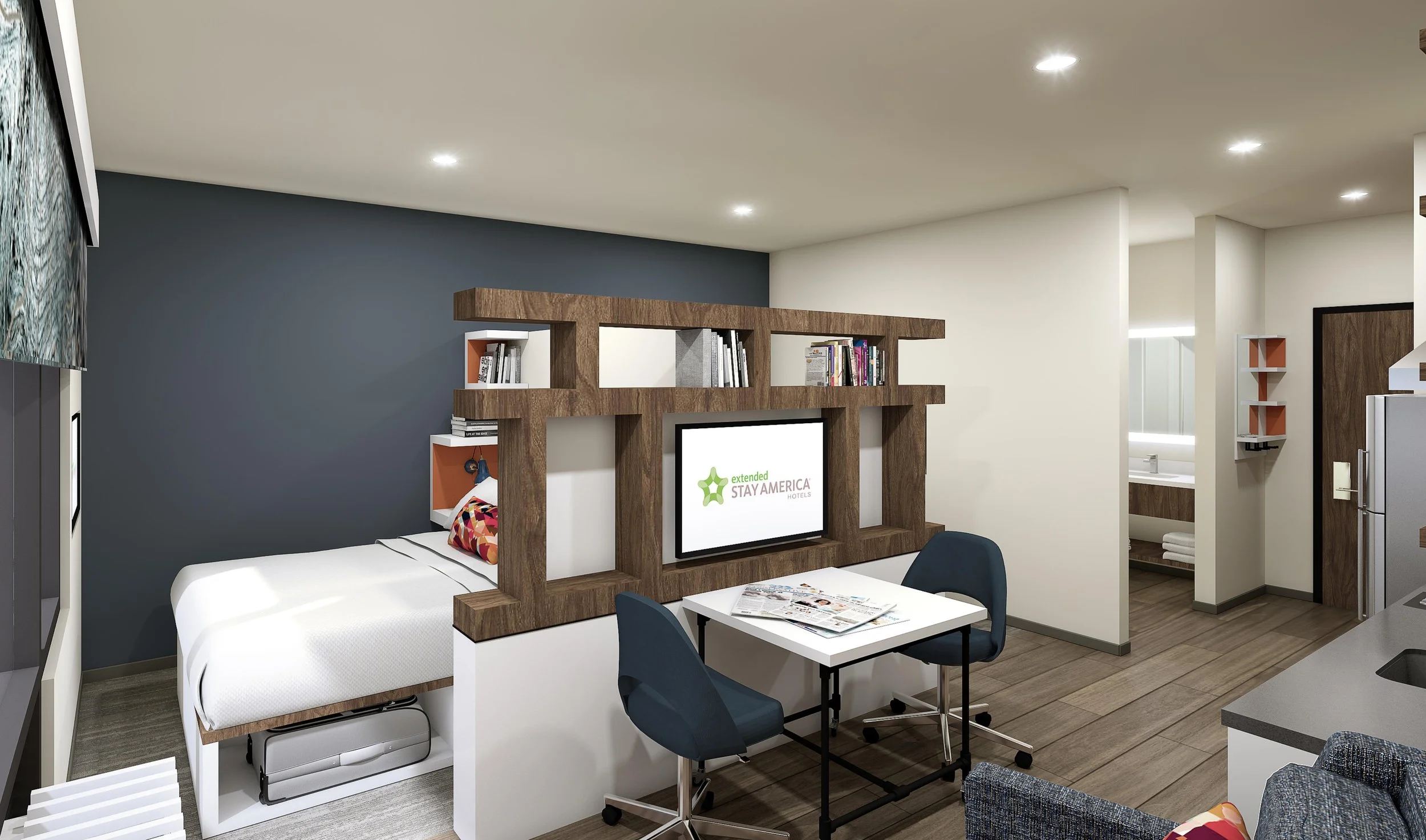 This extended-stay hotel prototype reimagines the guest experience with a vibrant, multifunctional design. The lobby serves as a social hub with flexible seating, interactive zones, and integrated technology. Guest rooms maximize function with custom furniture, making compact suites feel spacious and intuitive. Light, bright finishes and playful details create an energetic, modern aesthetic—offering guests a stylish, connected home away from home for business or leisure.